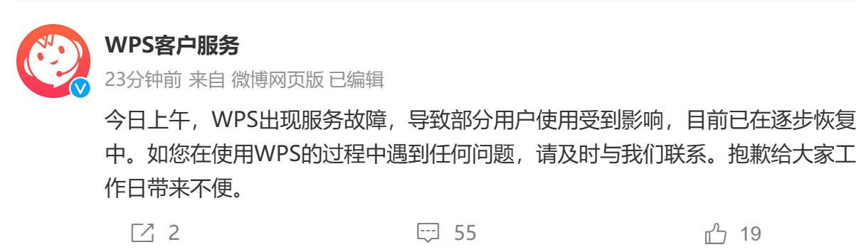 不久后,WPS客户服务发布声明并致歉,“今日上午,WPS出现服务故障,导致部分用户使用受到影响,目前已在逐步恢复中。”