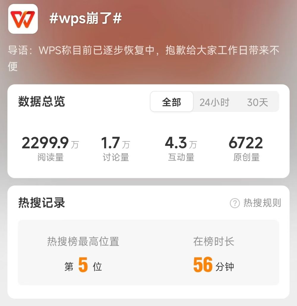 8月21日上午,#WPS崩了#登上微博热搜,最高冲至第5位。