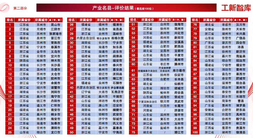 《研究》显示,我国产业名区、产业名县呈现“东强中壮西进”的区域分布格局。在评价结果前100位城区和前100位县域中,东部地区占140席,包括70个城区和70个县域,总计占比70%。中部地区占36席,包括14个城区和22个县域,总计占比18%。西部地区占22席, 包括15个城区和7个县域,总计占比11%。东北地区仅占2席,总计占比1%。