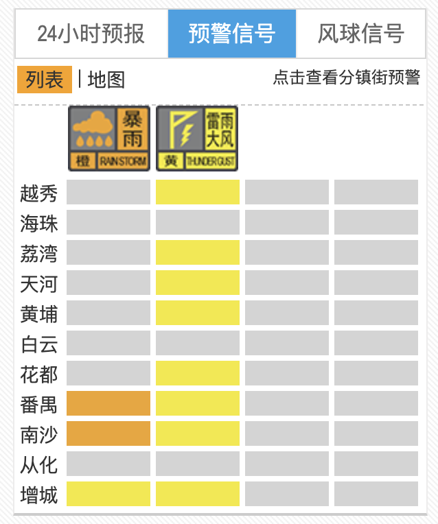 截至16:00,除海珠、白云、从化外,广州8区挂雷雨大风黄色预警。此外,番禺、南沙暴雨橙色预警生效中,增城暴雨黄色预警生效。