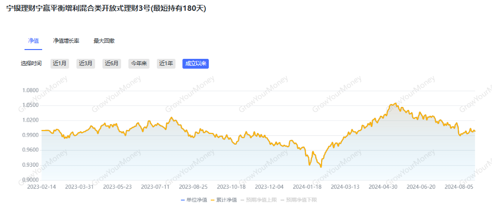 榜首宁银理财“宁赢平衡增利3号(最短持有180天)”为中风险偏债类混合理财,上半年末资产规模为2663.57万元,杠杆率维持在较低水平。该产品统计基期累计净值处于破净状态,绝大部分收益来源于净值修复。截至8月23日,该产品累计净值为0.997754,成立以来年化收益为-0.15%,仍处于浮亏状态。