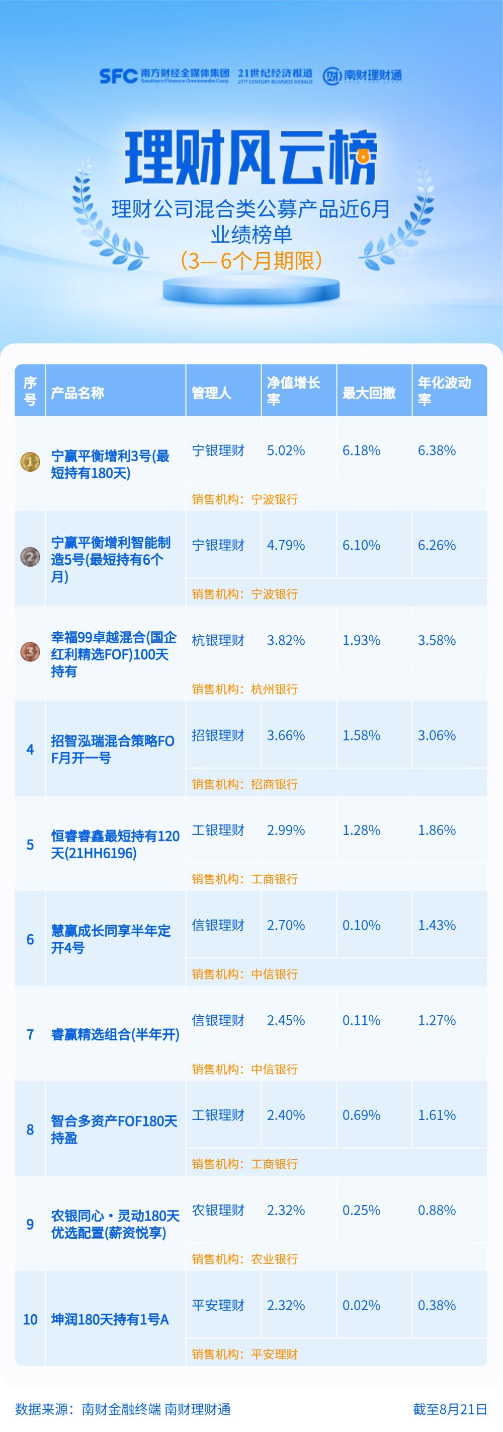 在理财公司投资期限为3—6个月(含)的混合类公募产品近6月业绩榜单中,7家理财公司产品进入榜单前十。其中,宁银理财、工银理财和信银理财各上榜2只产品,杭银理财、招银理财、农银理财和平安理财各有1只产品上榜。