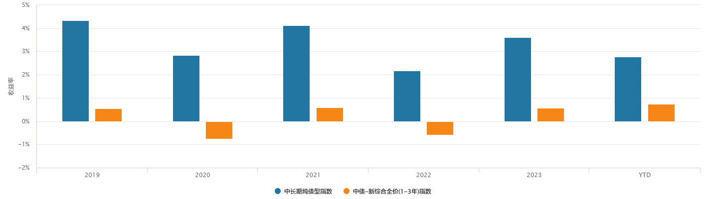由于市场变化,该产品在2024年两次调整年化业绩比较基准。在第一次调整中,其年化业绩比较基准由最初的区间报价2%—8%调整至挂钩报价“25%*中证800指数收益率+65%*中长期纯债型基金指数收益率(885008.W)+10%*中国人民银行活期存款基准利率”。一般而言,区间报价和固定报价产品能较为直观展示业绩预期,挂钩报价则较为贴合挂钩标的业绩表现变化情况。在第二次调整中,该产品业绩比较基准中的“中长期纯债型基金指数收益率(885008.W)”被替换为“中债-新综合全价(1-3年)指数收益率(CBA00123.CS)”,WIND数据显示,二者年初至8月26日区间涨幅分别为2.78%和0.73%,历年度收益差距较大。