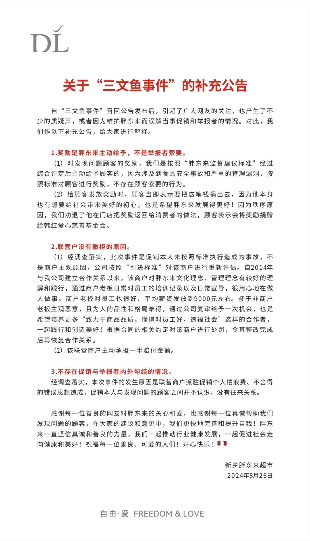 8月26日晚,新乡胖东来超市发布关于“三文鱼事件”的补充公告,称奖励是胖东来主动给予,不是举报者索要。经调查落实,不存在促销与举报者内外勾结的情况。
