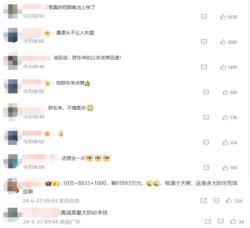 随后,#胖东来为买擀面皮顾客补偿共883.3万元#冲上热搜第一。对此,网友们也纷纷表示:“是真的把顾客当上帝了”“真诚才是必杀技”“说实话,胖东来的公关非常迅速!”