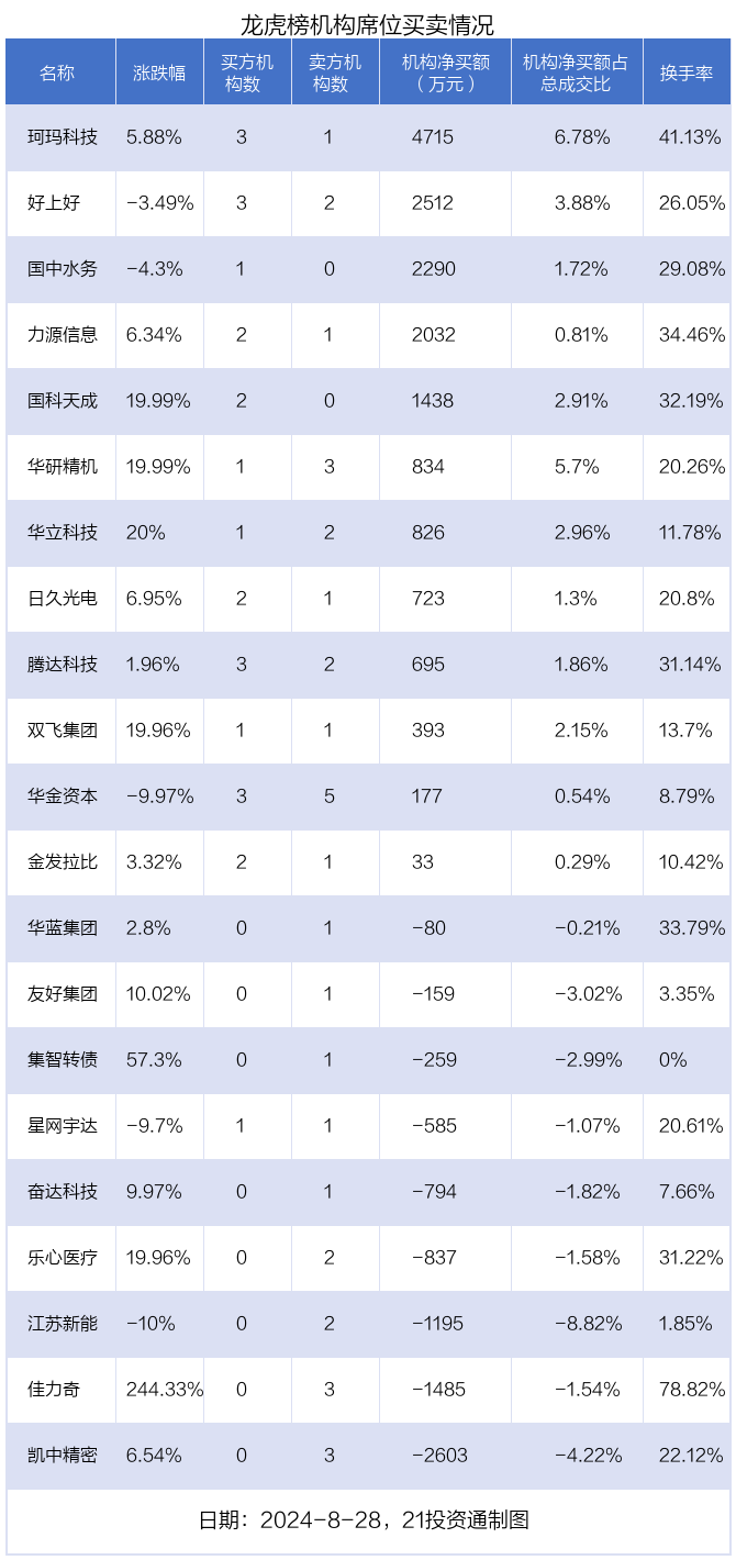 8月28日,21只个股龙虎榜出现了机构的身影,机构合计净买入8671.7万元。具体来看,机构净买入12股,净卖出9股。