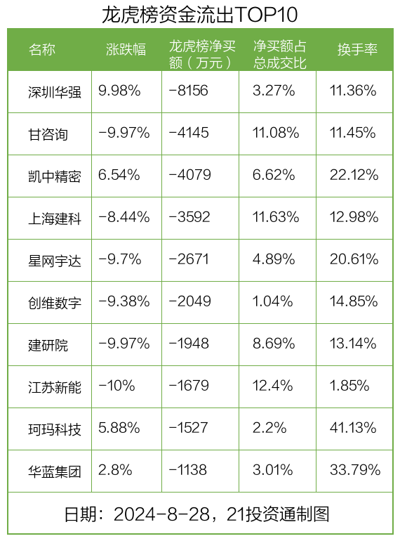 而龙虎榜中资金净流出最多的是深圳华强(000062.SZ),被净卖出为0.82亿元,占总成交金额的3.27%。深圳华强收盘上涨9.98%,换手率为11.36%。