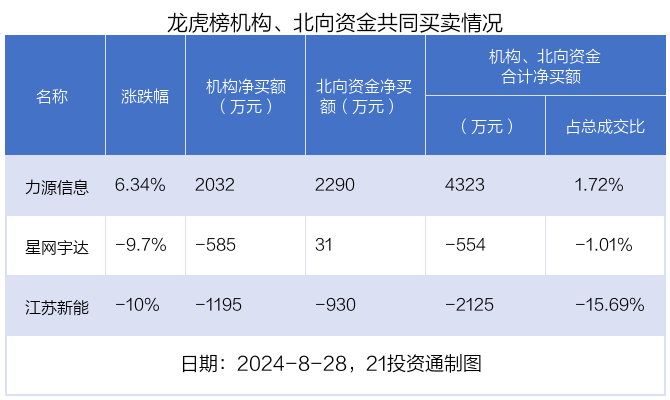 值得注意的是,机构和北向资金共同净买入了力源信息;共同净卖出了江苏新能;在星网宇达上出现分歧,机构净卖出星网宇达585.35万元,北向资金净买入31.34万元。