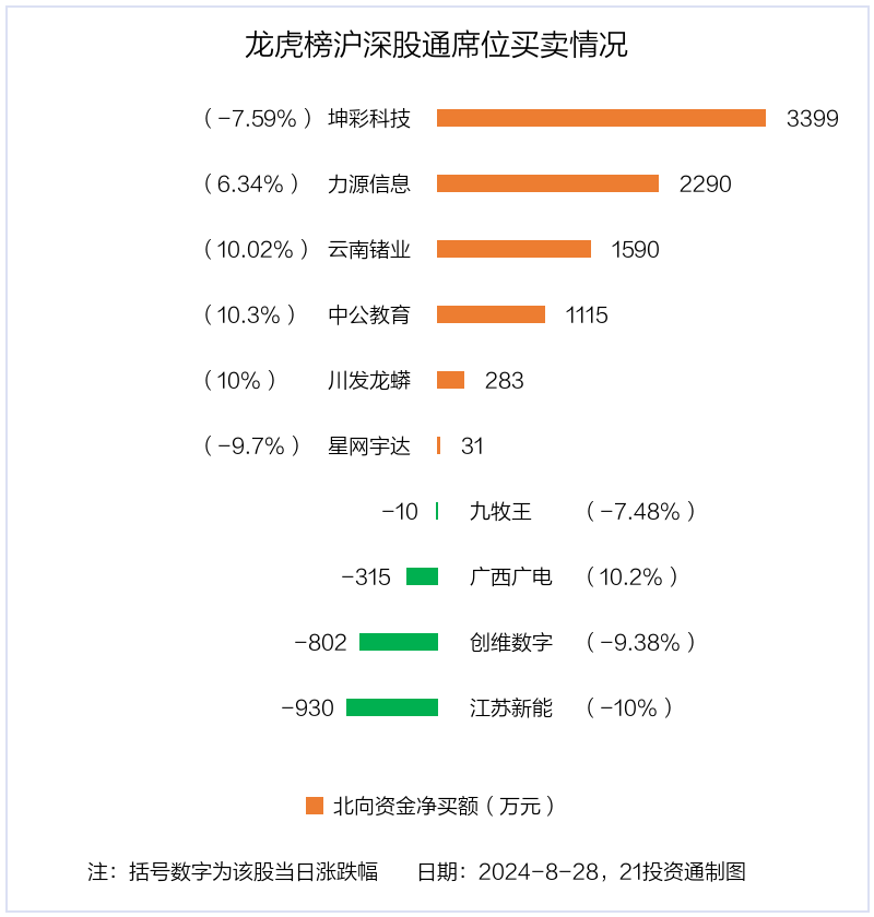 8月28日,北向资金参与龙虎榜中的个股共有10只,合计净买入6651.33万元。其中沪股通净买入1股,净卖出3股,合计净买入2143.92万元;深股通净买入5股,净卖出1股,合计净买入4507.4万元。