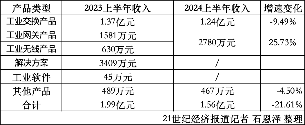 但在今年半年报中,三旺通信没有再单独列出解决方案的收入,并且产品结构由原先6项压缩至3项。2024半年报显示,三旺通信在工业交换产品、工业网关及无线产品、其他产品,分别实现营业收入1.24亿元、2780万元、467万元。综合计算下来,三旺通信在工业产品上收入下滑21.61%。