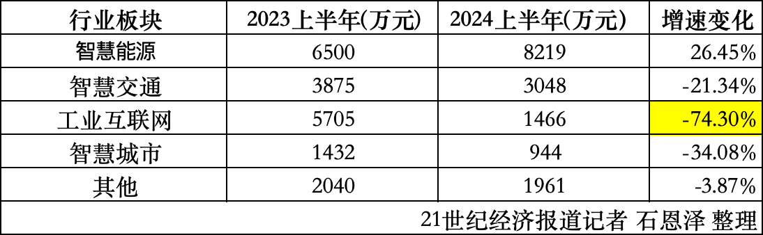 但在2024年中期,智慧能源、智慧交通、工业互联网、智慧城市以及其他行业板块分别实现营业收入8219万元、3048万元、1466万元、944万元、1961万元。可以看到,最能够体现公司向解决方案转型的工业互联网板块,收入下滑74.3%,仅为去年同期的1/4。