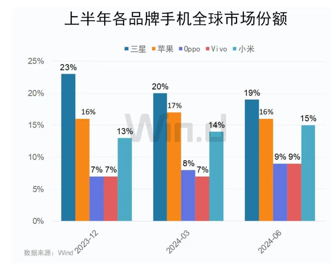 据Wind统计,从全球手机市场份额来看,上半年末,三星、苹果和小米三大品牌全球市场份额都在15%以上,紧随其后Vivo和Oppo全球市场份额为9%。