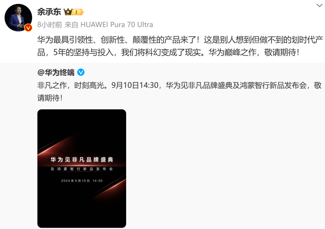 华为常务董事、终端BG董事长、智能汽车解决方案BU董事长余承东回应称,华为最具引领性、创新性、颠覆性的产品来了!“这是别人想到但做不到的划时代产品,5年的坚持与投入,我们将科幻变成了现实。华为巅峰之作,敬请期待!”余承东说道。