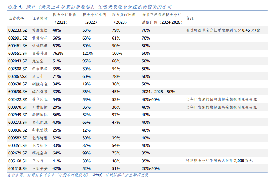 未来分红规划的发布既能提高公司分红的稳定性,又能部分提高分红比率,增强公司吸引力。统计近期发布的《未来三年股东回报规划(2024-2026)》公告,存在两类情况,公司首次发布未来现金分红规划和公司连续多年发布相关公告;对于首次发布未来现金分红规划的公司来说,公司未来持续分红的稳定性有所提升;对于连续多年发布分化规划的公司,存在部分公司的现金分红最低比例的标准不断提高,在原有规划里的每年现金分红最低比例提升,或在近三年实际现金分红比例上进一步提升。
