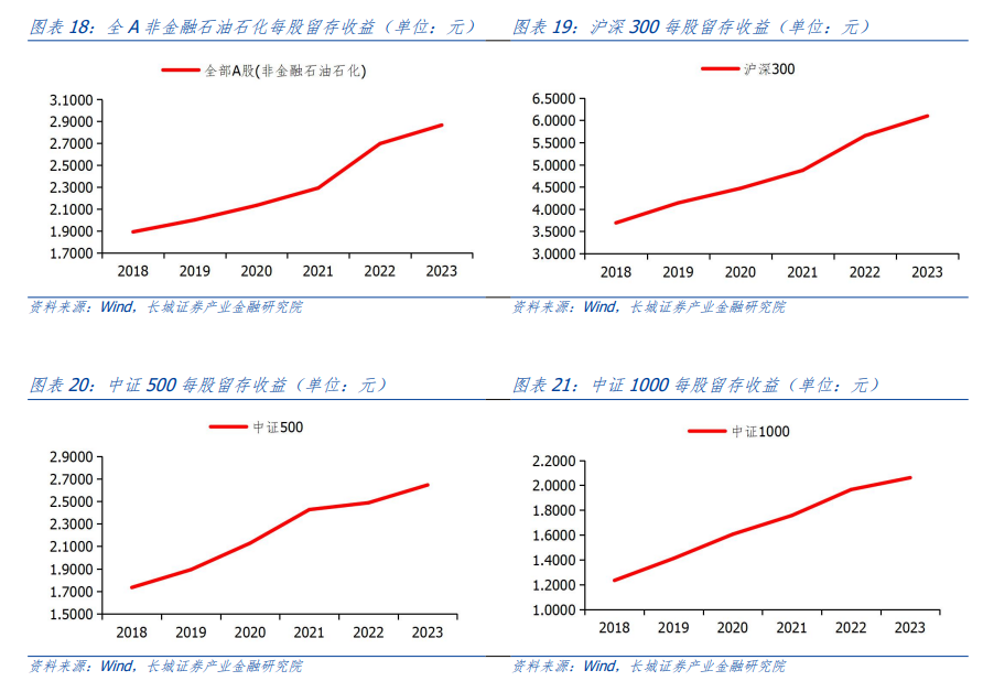 留存收益:全A非金融石油石化稳步提升,其中沪深300留存收益较多。留存收益是指企业从历年实现的利润中提取或形成的留存于企业的内部积累,包括盈余公积和未分配利润两类,其中企业对于未分配利润的使用有较大的自主权,可用于现金分红等。近年来,全A非金融石油石化的留存收益持续攀升,其中2023年沪深300的每股留存收益达6.10元,均大幅高于中证500、中证1000的每股留存收益。