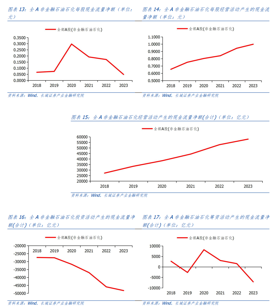 现金流:经营现金流流入稳定增长,投资现金流流出降速,筹资现金流转为流出。观察近几年全A非金融石油石化的每股现金流净额,每股经营活动产生的现金流量净额稳定增长,但每股现金流量净额却呈现下降趋势,其主要原因是投资现金流在不断流出、筹资现金流从流入转为流出。从金额体量上比较,以2023年为例,全A非金融石油石化的经营活动产生了近5.8万亿净流入,然而投资活动产生4.8万亿净流出,极大消耗经营活动产生的净流入,筹资现金流主要因为偿还债务净流出0.7万亿(筹资现金流净额跟随资本负债率于2020年后呈现下降趋势)。未来需持续观察经营现金流流入增速和投资活动现金流流出放缓情况。