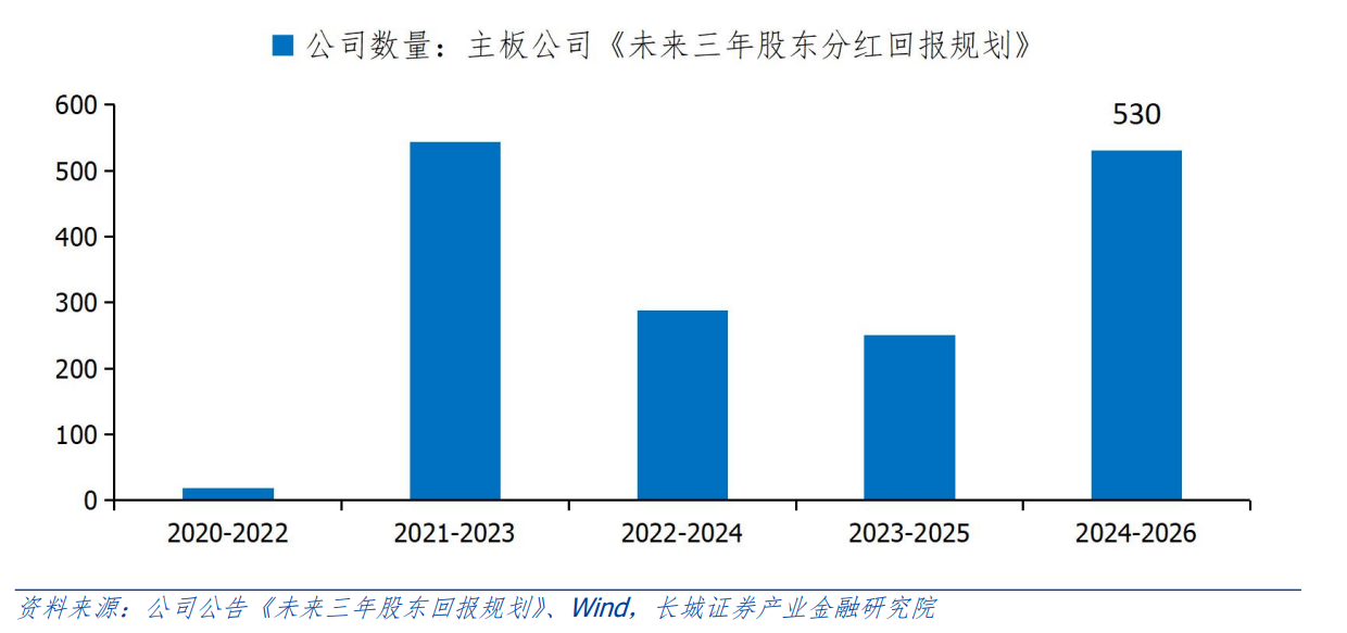 新“国九条”下,分红机制已悄然发生变化,体现在发布《未来三年股东回报规划》的公司数量在上升。在证监会政策文件指引下,部分上市公司发布《未来三年股东回报规划》,该公告包含未来三年现金分红方案(现金分红比例、金额等),是红利研究不可忽视的重要内容。截止至2024年8月22日,主板公司共计530家披露了《未来三年(2024年-2026年)股东回报规划》,考虑到目前处于8月,公司数量仍有较大上升空间。今年新“国九条”发布后,该公告数量或呈现加速增长。