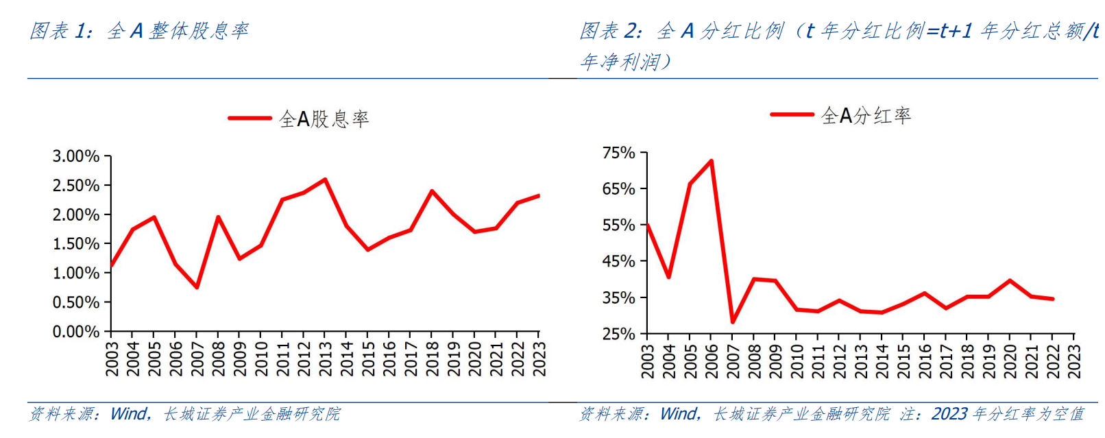 新“国九条”鼓励分红,将进一步提高A股整体股息率,吸引长期资金入市。新“国九条”鼓励上市公司现金分红,对多年未分红或分红比例偏低的公司实施警示,对分红优质公司进行鼓励并进一步提高股息率。同时,严格规范大股东减持,亦将侧面刺激上市公司进行现金分红。总体上,新“国九条”或将提升全A整体股息率,提高A股对于长期资本(如保险等)的吸引力。以年维度,2023年全A股息率2.31%,2022年全A分红比例34.46%。