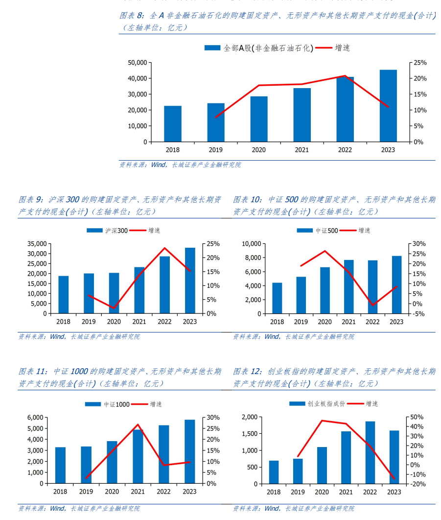 资本开支:目前主要指数的增速仍为正,但增速水平或初显放缓态势。从现金流指标“购建固定资产、无形资产和其他长期资产支付的现金”看,目前大部分所选指数的资本开支仍维持正增长,但2023年增速相较前几年存在减弱的迹象,后续有待观察;其中,创业板指的资本开支存在下降趋势,2023年创业板指的增速为-14.7%,创业板指中公司根据一级行业分类,环保、电子、纺织服饰行业维持相对较低的资本开支。