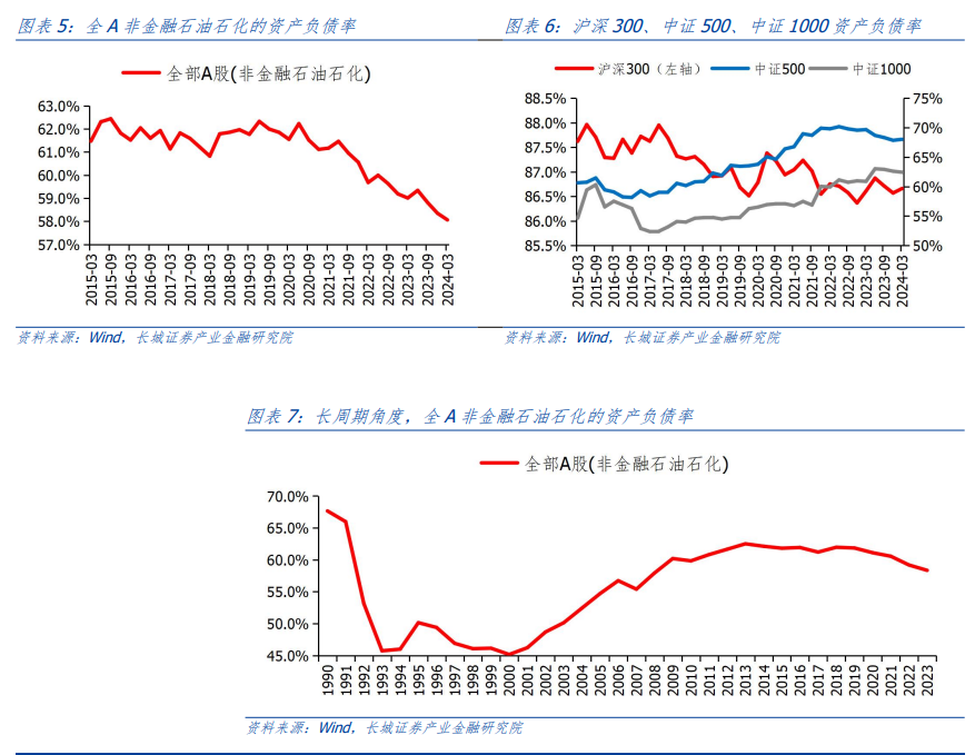 资产负债率:全A非金融石油石化处于降杠杆中。2023年后,全A非金融石油石化的负债率或维持下降趋势,中证500、中证1000或见顶回落。由于沪深300里银行企业普遍高负债率,沪深300负债率普遍高于中证500和中证1000, 2024一季度三者读数分别为86.7%、68.0%、62.4%。