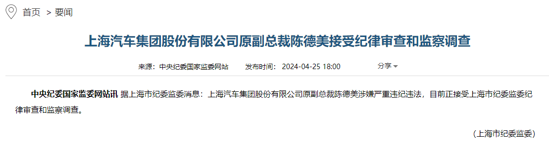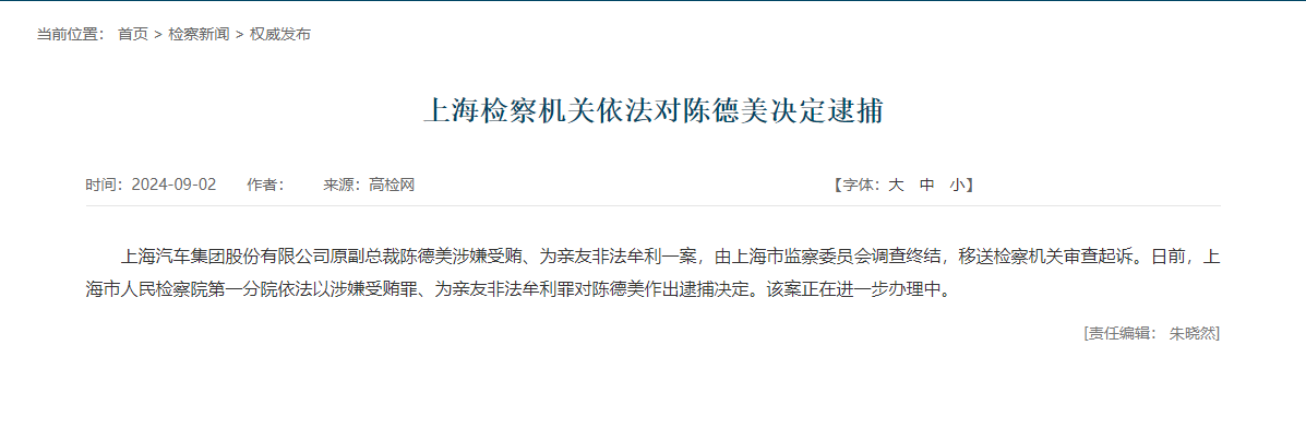 根据9月2日高检网消息,上海汽车集团股份有限公司原副总裁陈德美涉嫌受贿、为亲友非法牟利一案,由上海市监察委员会调查终结,移送检察机关审查起诉。日前,上海市人民检察院第一分院依法以涉嫌受贿罪、为亲友非法牟利罪对陈德美作出逮捕决定。该案正在进一步办理中。