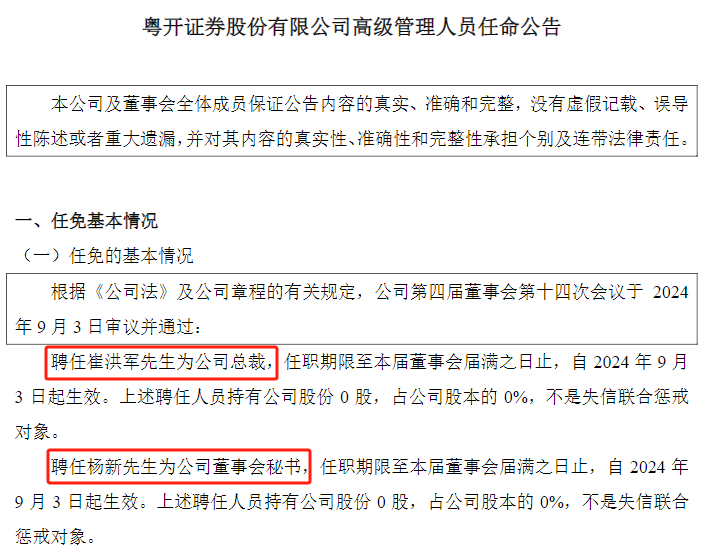 9月3日下午,粤开证券(830899)公告,聘任崔洪军为公司总裁,聘任杨新为公司董事会秘书,副总裁朱洪涛不再兼任董秘岗位,自2024年9月3日起生效。