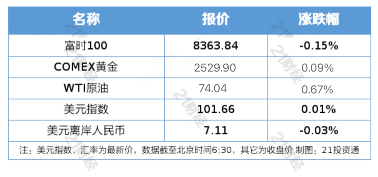 欧洲三大股指9月2日涨跌不一。截至当天收盘,英国富时100指数报收于8363.84点,较前一交易日下跌12.79点,跌幅为0.15%;法国巴黎股市CAC40指数报收于7646.42点,较前一交易日上涨15.47点,涨幅为0.20%;德国法兰克福股市DAX指数报收于18930.85点,较前一交易日上涨23.93点,涨幅为0.13%。