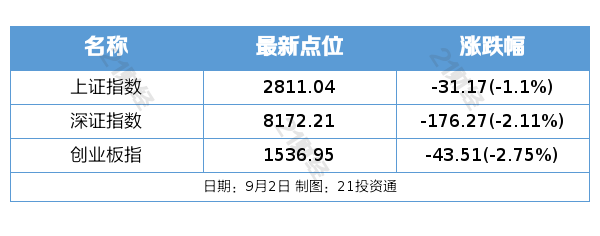9月2日,市场全天低开低走,沪指再创调整新低,创业板指跌近3%。截至收盘,沪指跌1.1%,深成指跌2.11%,创业板指跌2.75%。总体上个股跌多涨少,全市场超4400只个股下跌。沪深两市成交额7057亿元,较上个交易日缩量1709亿元。板块方面,保险、ST板块、煤炭、银行等板块涨幅居前,中船系、半导体、白酒、游戏等板块跌幅居前。