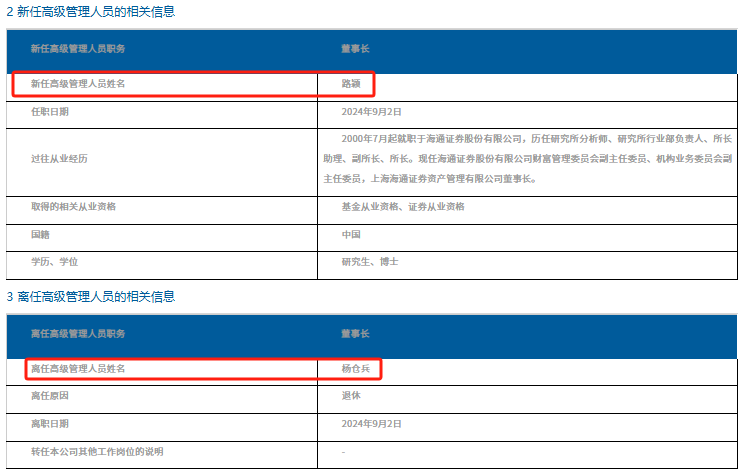 9月3日晚间,海富通基金发布关于董事长变更的公告,路颖出任公司新一届董事长,原董事长杨仓兵因退休离任。