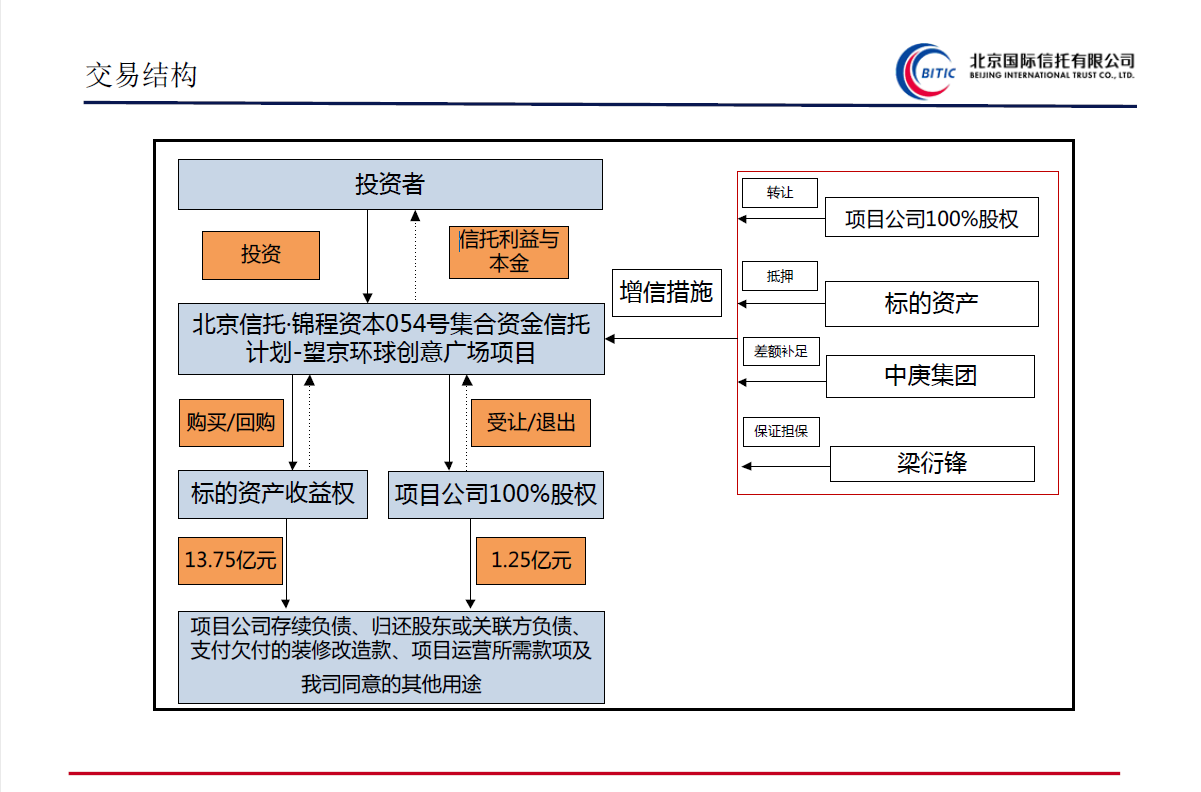 根据推介材料,锦程资本054号信托规模15亿元,其中13.75亿元受让标的资产,即位于北京市朝阳区阜荣街10号1层、2层、3层、-1层商业及-2层汽车库的环球创意广场的收益权,北京京西深国投商业管理有限公司(下称“京西深国投公司”)按约定回购上述收益权,剩余1.25亿元受让福建中庚置业有限公司(下称“中庚置业”)持有的京西深国投公司100%股权。
