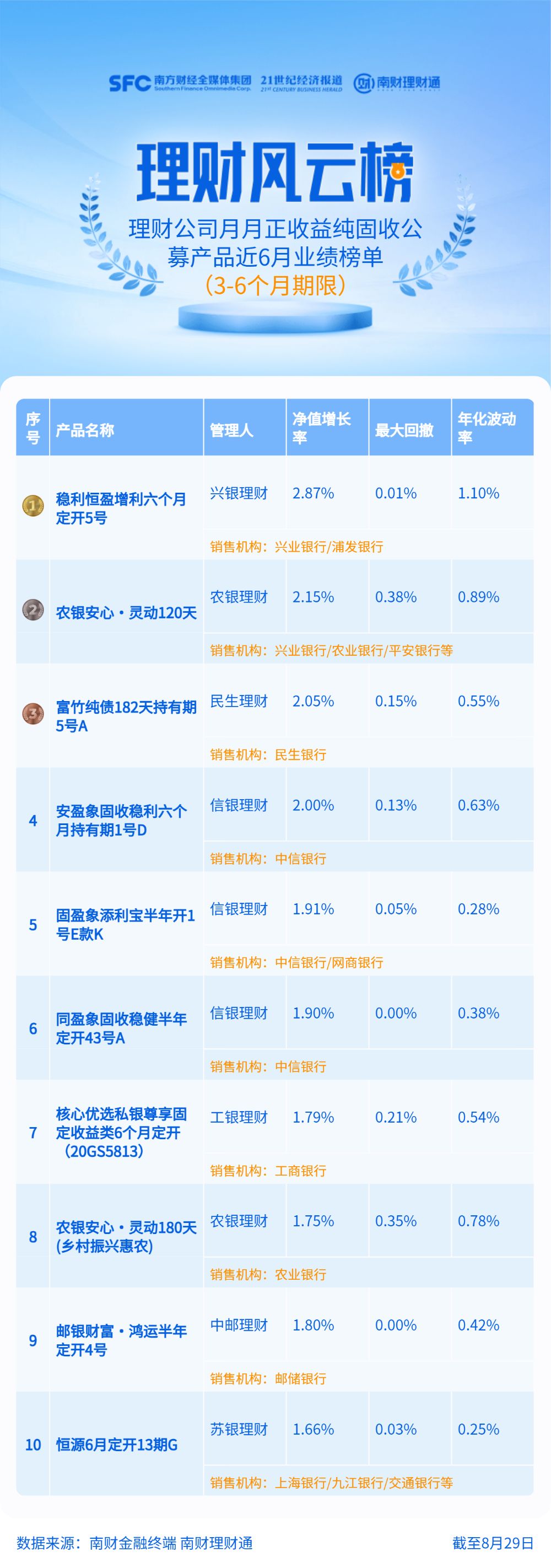 兴银理财“稳利恒盈增利六个月定开5号”以2.87%的近6月净值增长率位列第一,农银理财“农银安心·灵动120天”和民生理财“富竹纯债182天持有期5号A”以2.15%和2.05%的净值增长率位列第二和第三。