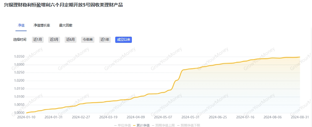 榜首兴银理财“稳利恒盈增利六个月定开5号”成立于2024年1月10日,为中低风险固定收益类产品,该产品首个投资周期净值增长率为3.31%,年化后为6.17%,同期业绩比较基准为2.7%—4%。具体来看,其累计净值在5月14日至5月28日区间涨幅贡献了首个投资周期净值涨幅的37.6%。