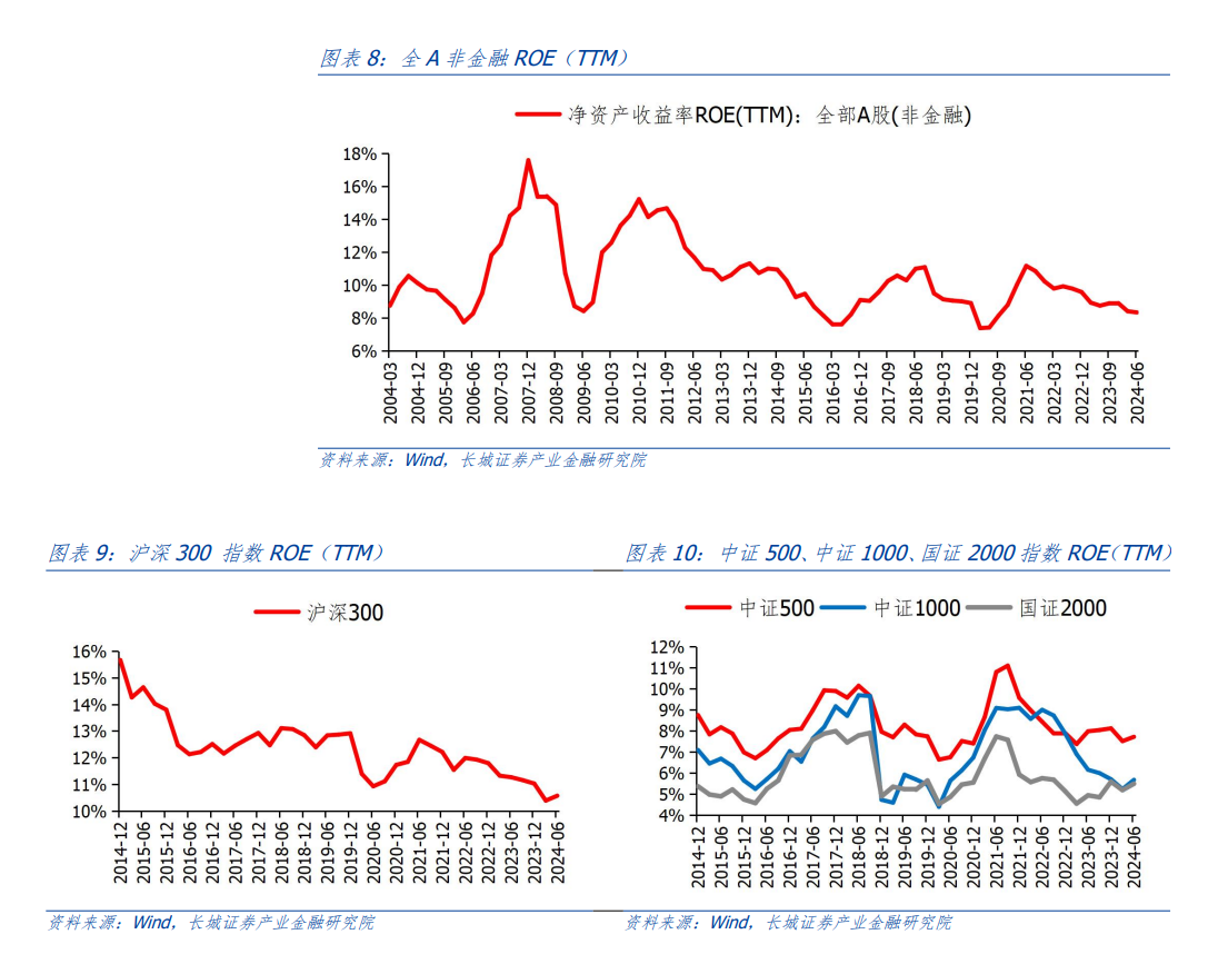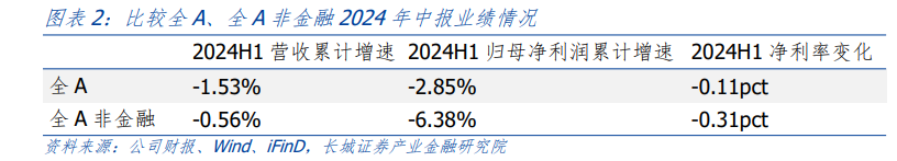 2024中报,全A非金融归母净利润15297亿元,同比减少1042亿元,对应归母净利润累计增速 -6.38%;2024第二季度全A归母净利润增速-7.17%(2024Q1:-5.16%)。