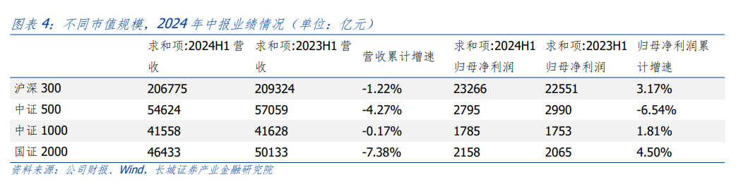 大中小盘:综合营收、利润增速,沪深300、中证1000指数整体表现相对较好,中证500较为低迷。按市值规模不同,可分成大盘、中盘、小盘、微盘企业,分别对应指数沪深300、中证500、中证1000、国证2000。2024年中报,主要指数的营收增速均为负数,按营收增速排序,中证1000代表的小盘股相对较好,营收累计增速-0.17%,或因中证1000包含较多的电子公司(2024上半年电子行业表现突出),国证2000代表的微盘股表现最差,营收累计增速-7.38%。按业绩增速排序,除中证500外,其余三个指数的归母净利润累计增速均为正数。