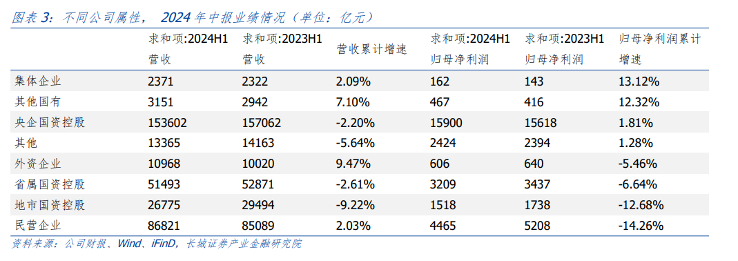 公司属性:上半年,国企业绩普遍优于民企,其中央企优于省属国资、地方国资。按公司属性,可分成国企(央企、省属国资、地方国资)、民企、外资等。2024中报,按营收增速排序,外资企业普遍优于国企和民企;按归母净利润增速排序(不考虑集体企业、其他),央企优于外资企业、省属国资、地方国资、民企。国企内部表现分化,央企由于包括国有行等大型企业,营收、净利润占全A比重较高,且经营情况稳定,然而省属国资、地方国资财务数据普遍低迷。