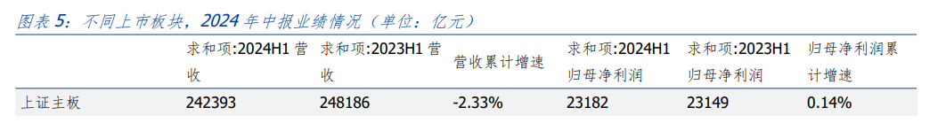 分别比较公司属性、市值规模、上市主板的中报业绩情况,营收增长上外企占优,盈利稳健上国企优于民企;综合营收和净利润增速,沪深300、中证1000中报表现较好;上市板块中,创业板相对占优,2024年中报营收增速5.89%,归母净利润增速0.23%。