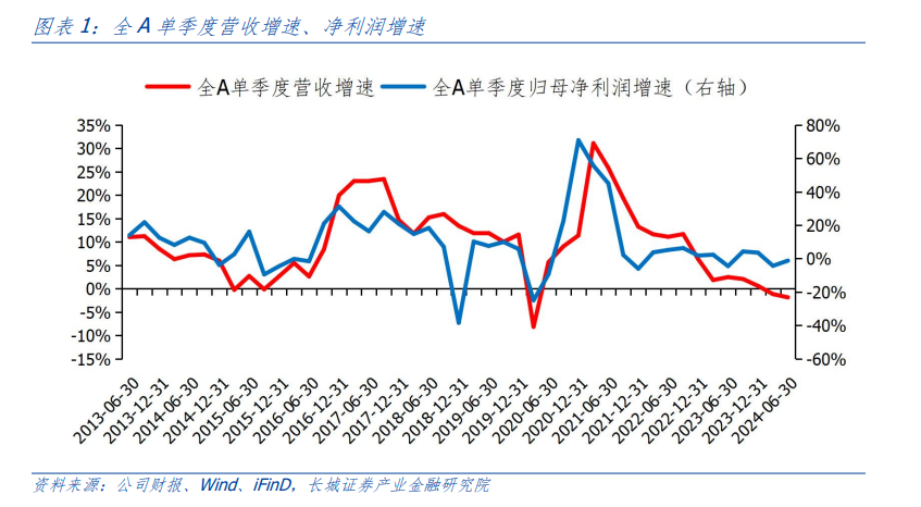 2024中报,全A营业收入共计348545亿元,同比减少5419亿元,对应营收累计增速 -1.53%;2024第二季度全A营收增速-1.87%(2024Q1:-1.17%)。