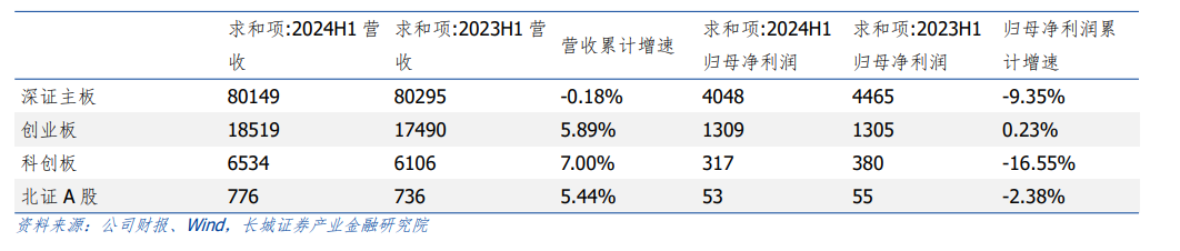 上市板块:综合营收、利润增速,创业板表现最好。按上市板块,可分成主板(上证主板、深证主板)、创业板、科创板、北证。纵观各个板块,创业板表现最好,2024年中报营收增速5.89%,归母净利润增速0.23%;然而科创板盈利能力大幅下滑,2024年中报归母净利润增速-16.55%。