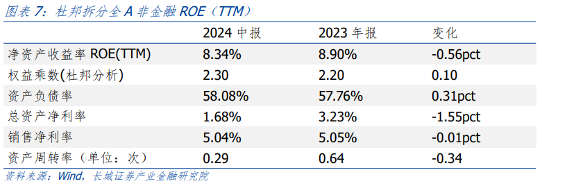 资产周转率大幅下滑拖累整体ROE。上半年,全A非金融净资产收益率8.34%,相较2023年年报,大幅下滑0.56pct。资产周转率的大幅下滑主要导致ROE的下滑,体现出目前企业普遍面临的问题,资产使用率较低。