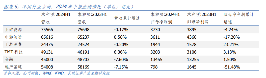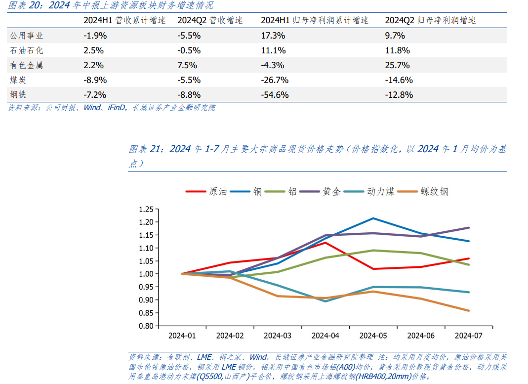 上游资源板块主要以销售大宗商品为主,业绩易受商品价格影响。上半年,铜、黄金价格大幅上涨,铝和原油价格小幅上涨,动力煤、螺纹钢价格大幅下跌,对应2024年中报公用事业(煤价下跌,发电成本下降)、石油石化、有色金属业绩增速较好,然而煤炭、钢铁行业营收增速、归母净利润增速下滑。