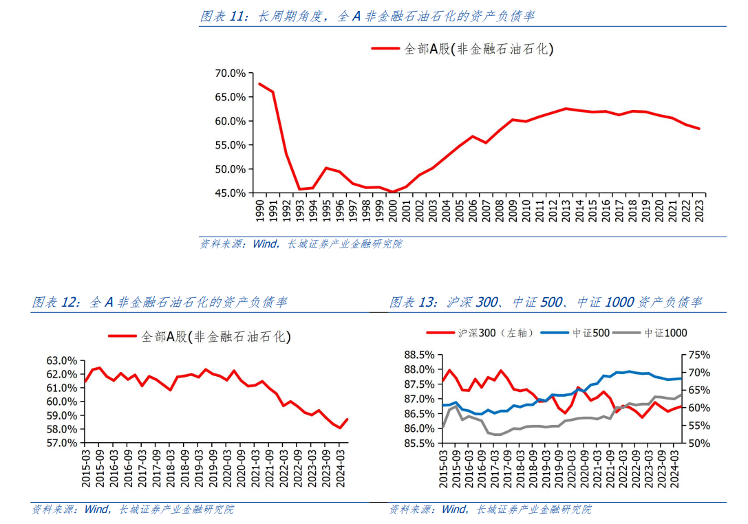资产负债率:全A非金融石油石化处于降杠杆趋势中。2017-2023年,全A非金融石油石化呈现大幅下降趋势,但是中证500、中证1000大幅上升。2020年后,全A非金融石油石化的资产负债率呈现下降趋势,下降幅度较大,2024一季度其资产负债率达58.1%。指数层面,2017年后,代表大盘股的沪深300资产负债率小幅下滑,然而代表中盘、小盘股的中证500、中证1000资产负债率大幅上涨,上涨幅度或接近10%。