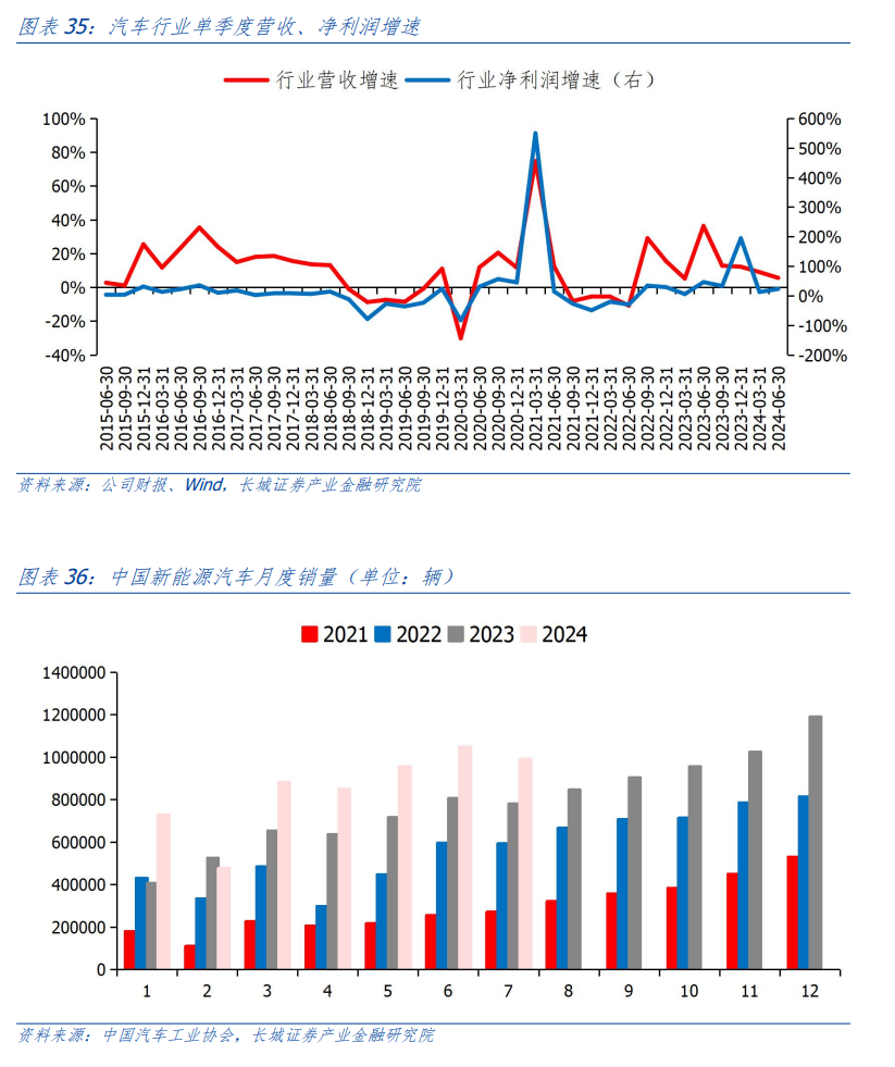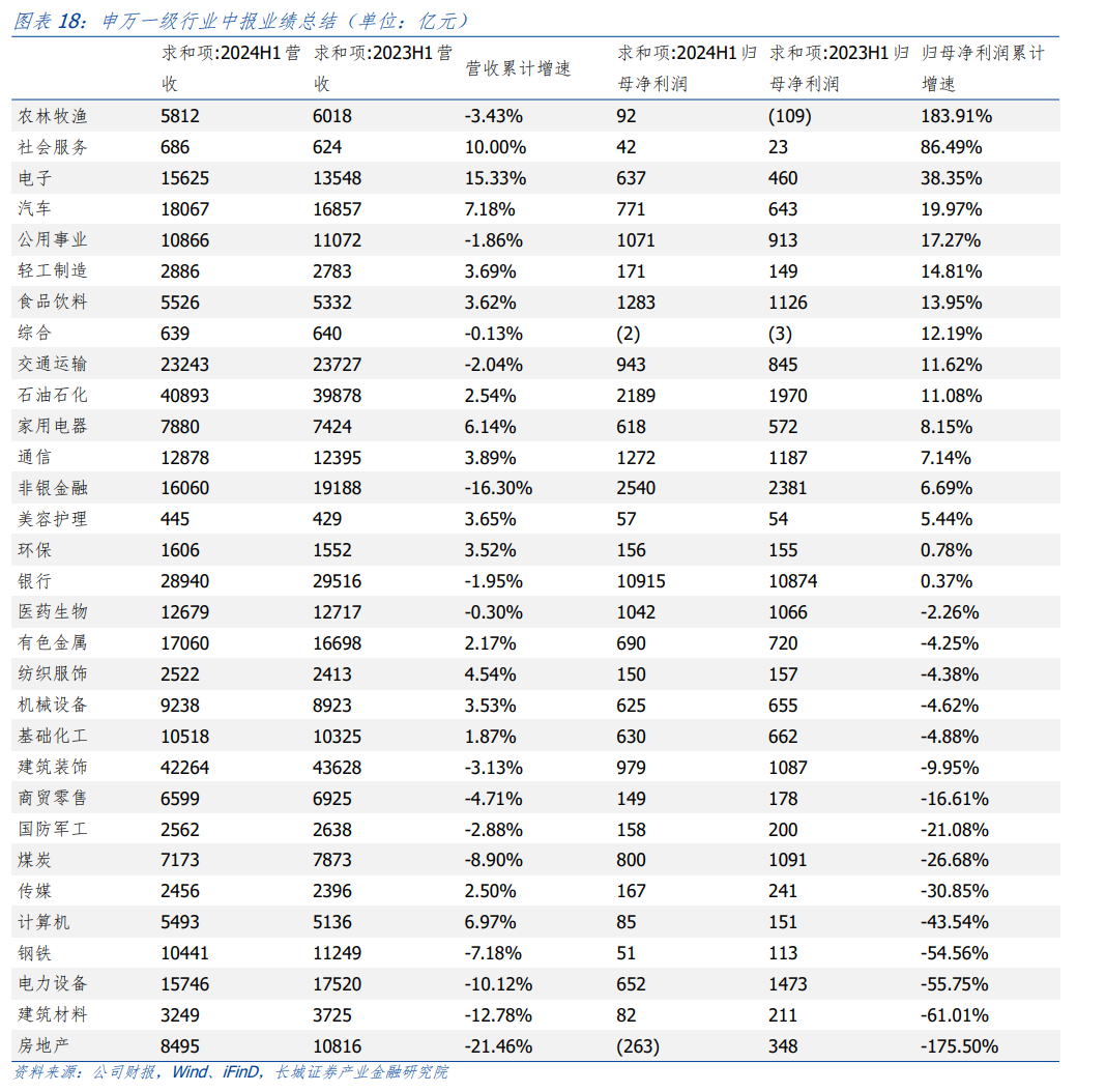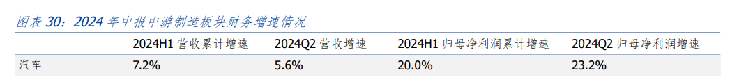 汽车:业绩增长大部分来源于国产新能源汽车销量大幅提升,受益于收入增长中量的增加,价格的变化目前影响较小。上半年,汽车行业中报营收累计增速7.2%,相较之前存在增速下调,中报归母净利润累计增速20.0%,单二季度行业营收增速5.6%,归母净利润增速23.2%。根据中国汽车工业协会,相较2023年同期销量,2024年1-7月国内新能源汽车销量同比增长31.1%,维持较高且平稳增速;但在新能源汽车渗透率增长放缓、车企互相竞争下,2024年6月新能源汽车价格较2023年12月价格下滑2.36%;综合考虑价格下跌和销量增长对中报业绩的影响,目前新能源汽车降价对业绩增速的影响相对较少,后续仍需观察未来价格和销量的情况。