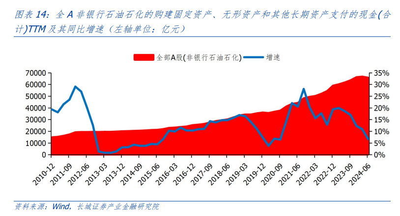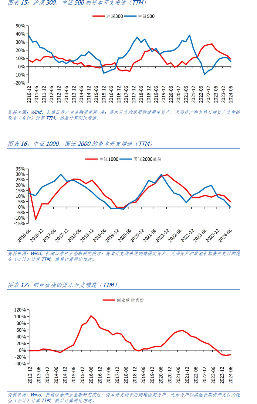 资本开支增速显著放缓。2024年中报全A非金融石油石化的资本开支增速下降至6.7%。虽然主要指数的资本开支增速水平仍为正,但增速水平呈现放缓态势,其中创业板指资本开支缩减程度较为领先,其资本开支增速为-13.5%。