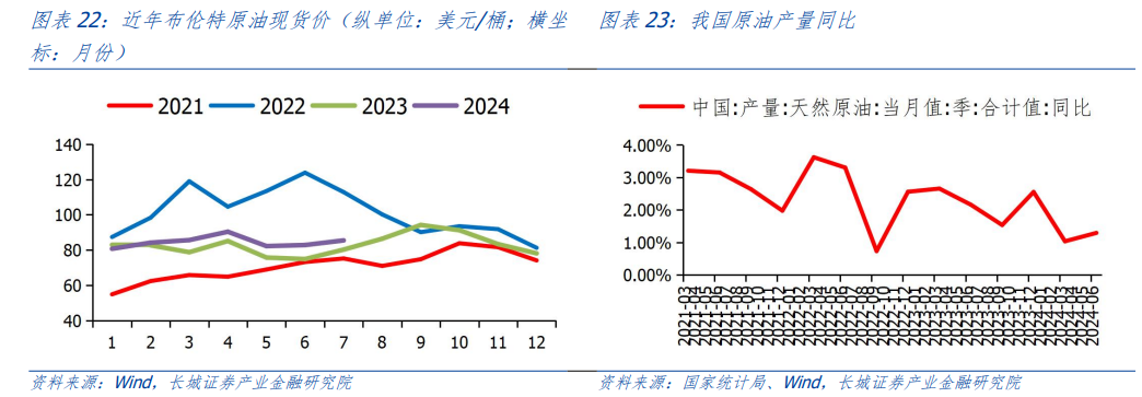 石油石化:上半年行业经营稳健,行业业绩保持稳定增长。2024年中报石油石化行业营收增速2.5%,归母净利润增速11.1%;相较中报增速,单二季度石油石化行业营收增速下滑至-0.5%,归母净利润增速依旧维持在高水平11.8%。从量价角度拆分,原油方面,相较去年上半年,2024年原油价格小幅提升,国内原油产量维持低增速,一二季度我国原油产量同比维持在1.03%、1.29%;天然气方面,相较去年上半年,今年天然气价格小幅下滑,国内天然气产量维持稳健增长,一二季度我国天然气产量同比维持在6.17%、6.98%。整体看,石油石化行业2024年上半年经营稳健,行业业绩持续稳定增长。