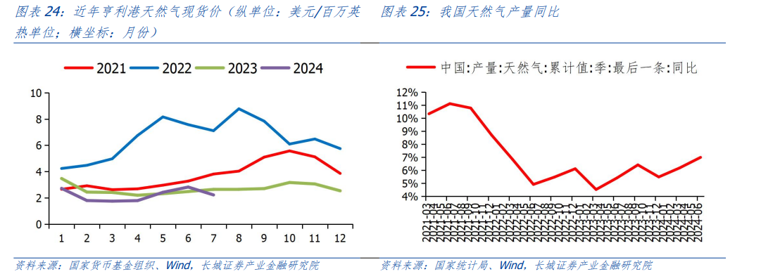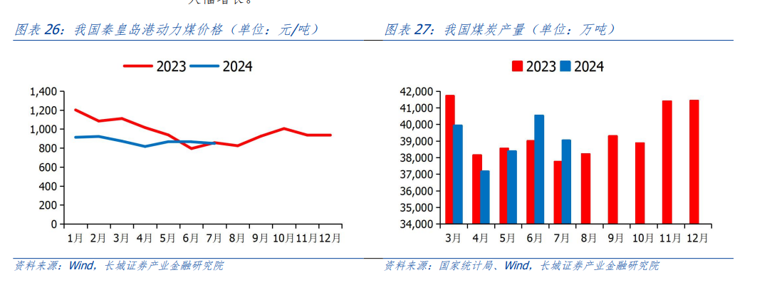 煤炭:高基数效应下,行业净利润同比负增。2024年中报煤炭行业营收增速-8.9%,归母净利润增速-26.7%,单二季度行业营收增速-5.5%,归母净利润增速-14.6%。相较2023年,今年煤炭产量和价格呈现低迷态势,导致我国煤炭行业营收增速、利润增速出现不同程度的下滑;从量价角度拆分, 2024年1-6月,我国煤炭价格均低于2023年同期水平;产量上,2024年3-5月,我国煤炭月度产量均低于去年同期,直至6月煤炭产量大幅增长。