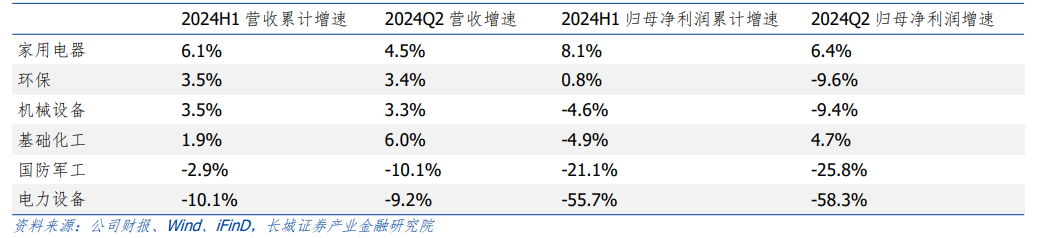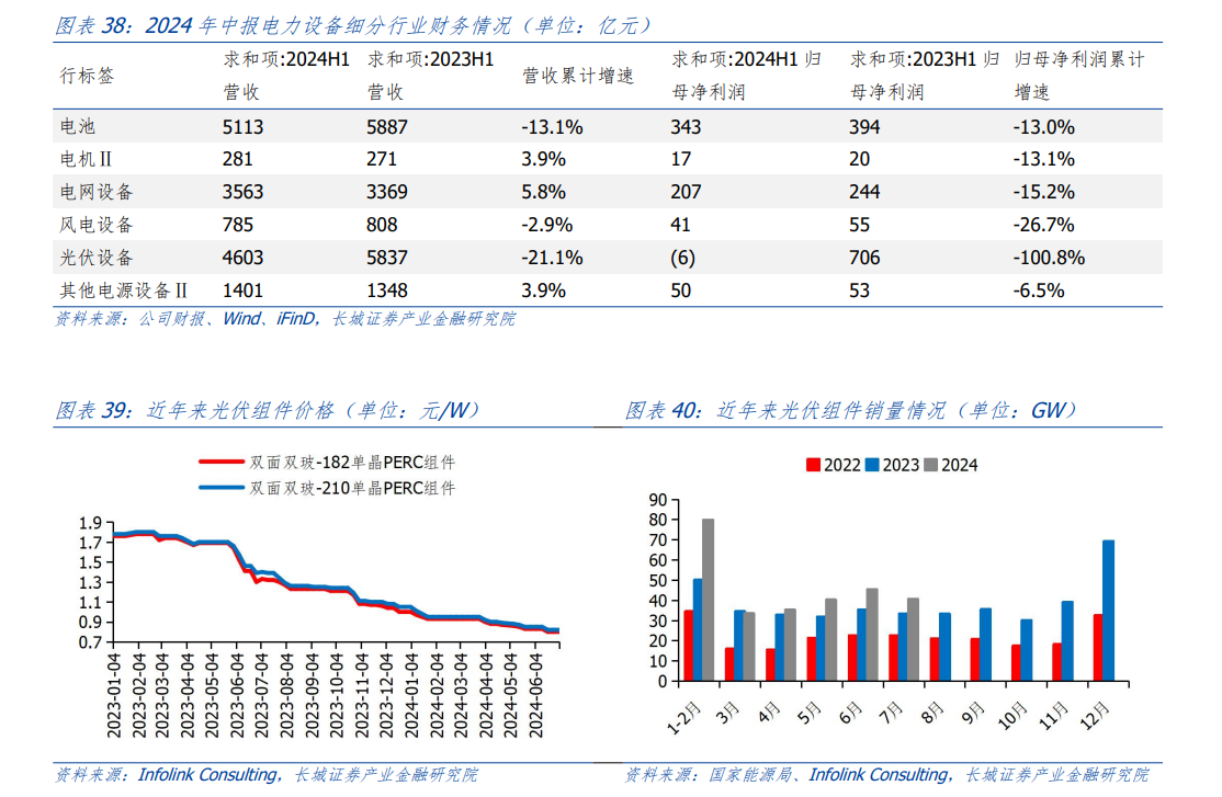电力设备:光伏产业链由盈转亏,拖累电力设备行业业绩。2024中报电力设备营收累计增速-10.1%,归母净利润累计增速-55.7%;单二季度电力设备营收增速-9.2%,归母净利润增速-58.3%。电力设备可分成光伏设备、电池、电网设备等。从中报归母净利润角度,细分行业均为负增长,其中光伏设备行业由盈转亏,上半年,光伏行业虽然在2023年高基数下组件销量进一步提升,但依旧抵挡不住组件价格不断下滑,行业内公司普遍由盈转亏。电池行业,由于行业内竞争加剧,行业盈利能力整体承压,其中电池化学品领域公司,如恩捷股份、天赐材料,呈现销量增长但产品价格大幅下滑,中报归母净利润大幅负增。电网设备,行业内公司业绩增速稳健增长,如特变电工(输电业务部分)、特锐德、平高电气等中报净利润稳步增长。
