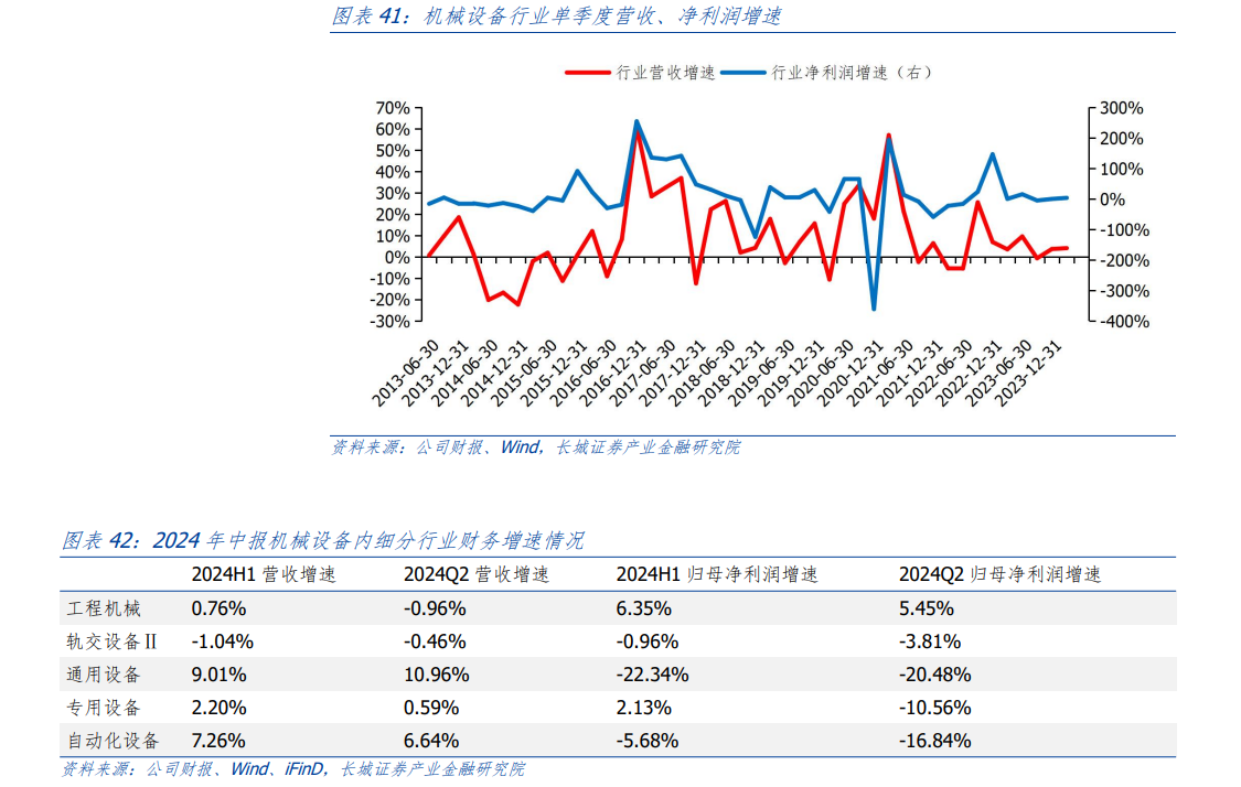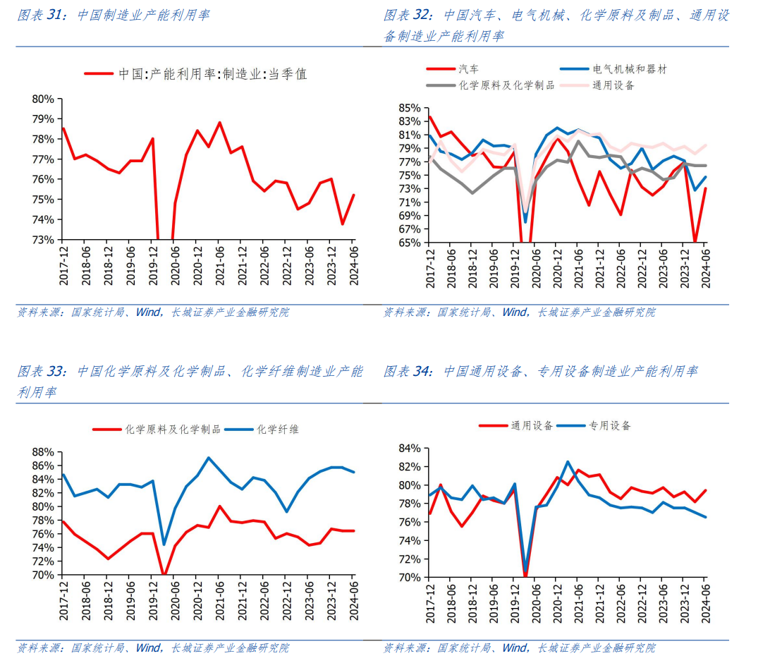产能利用率:制造业中,机械设备中的通用设备具备较高且稳定的产能利用率,或彰显通用设备行业拥有相对其他制造业较好的供需格局,相反汽车行业产能利用率较为波动。从产能利用率角度,2021年至今,中国制造业产能利用率呈现波动下滑,2024年二季度中国制造业产能利用率75.2%。比较制造业中细分行业,机械设备中的通用设备拥有相对较高且近期稳定的产能利用率,通用设备或具备较为稳定的供需格局,二季度行业产能利用率79.4%,高于其他制造业;相反,汽车行业产能利用率较为波动,二季度行业产能利用率73.0%。