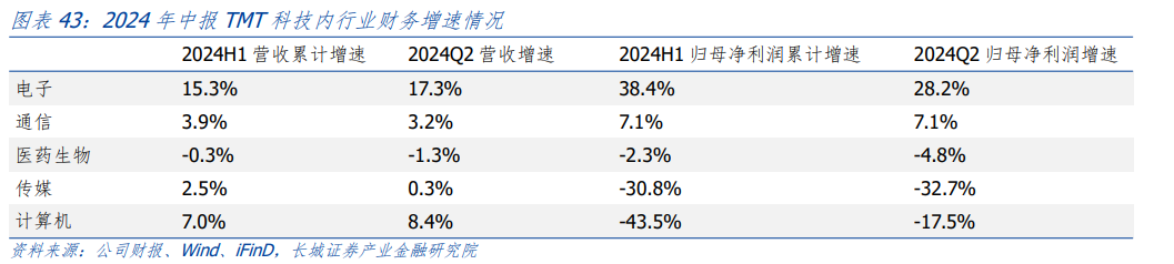 TMT科技:电子经营情况明显改善,医药生物业绩降幅或趋缓,逐渐脱离集采的影响。2024年中报,电子行业营收增速15.33%,归母净利润增速38.35%;医药生物营收增速-0.30%,归母净利润增速-2.26%。
