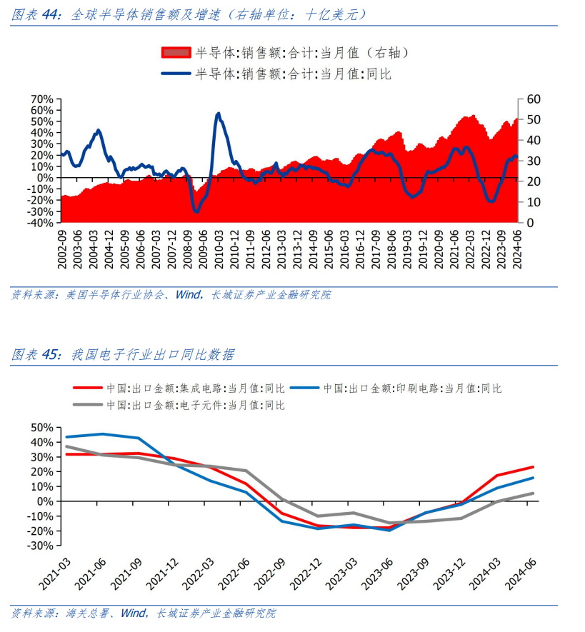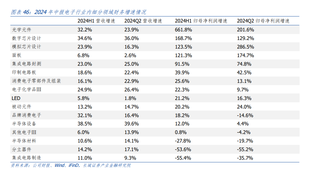 电子:全球半导体进入上行周期,行业中报业绩增长较好。在经历了2022-2023年的低价去库存之后,半导体行业现在的库存水平健康。随着AI从云端落实到终端,电子行业需求持续增长,半导体行业的新一轮上升周期已经开始;根据美国半导体行业协会披露的数据,全球半导体销售额同比从2023年四季度开始回正,截止至2024年6月,全球半导体销售额增速达18.4%,能有效提振国内电子行业出口需求,在低基数下,行业业绩回暖。从电子行业内细分领域看,中报归母净利润增速从高到低(排除业绩由亏转盈),分别是数字芯片设计、集成电路封测、印刷电路板等;其中,集成电路制造排名最后,其2024年中报归母净利润增速-55.4%。