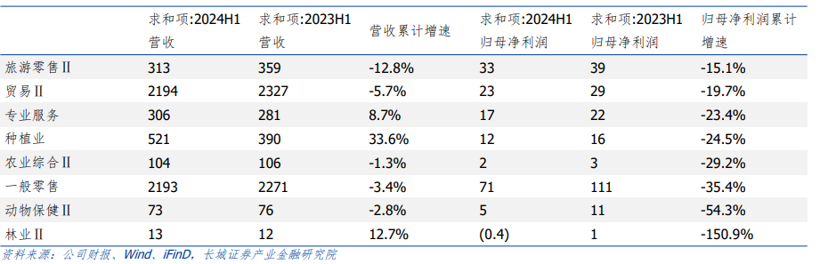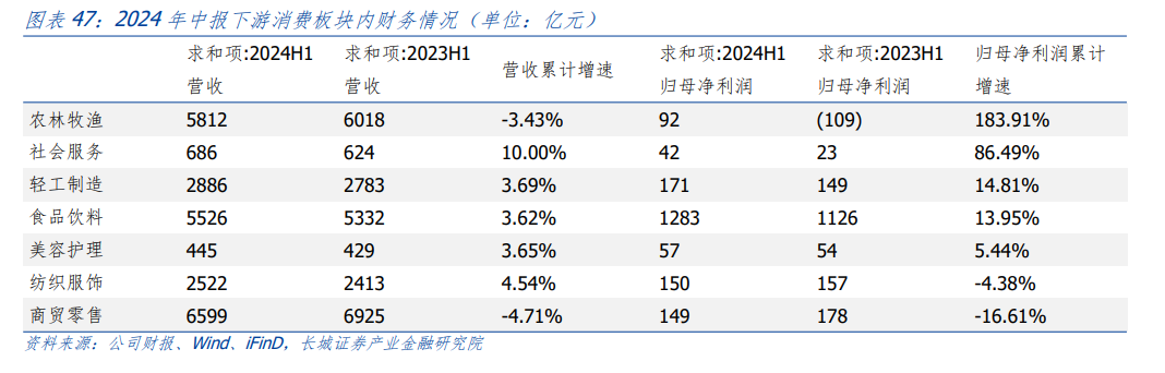 下游消费包含较多行业,按中报归母净利润累计增速从高到低排序,农林牧渔、社会服务、轻工制造、食品饮料排名靠前;其中,农林牧渔因猪价底部上涨,行业业绩由亏转盈。